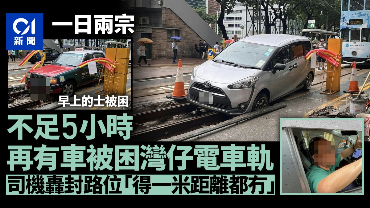 繼今早(20日)9時一輛的士誤闖灣仔莊士敦道電車軌被困後,同一位置下午1時許再有一輛七人車重蹈覆轍,亦是剛駛入電車軌被困,前轆卡在約30厘米深的路坑,進退不得。現場路邊豎有指示牌,寫上「電車以外車輛不准駛入」。其後電車車長報案求助,從網上圖片可見,七人車被困後,西行線電車服務亦受阻。