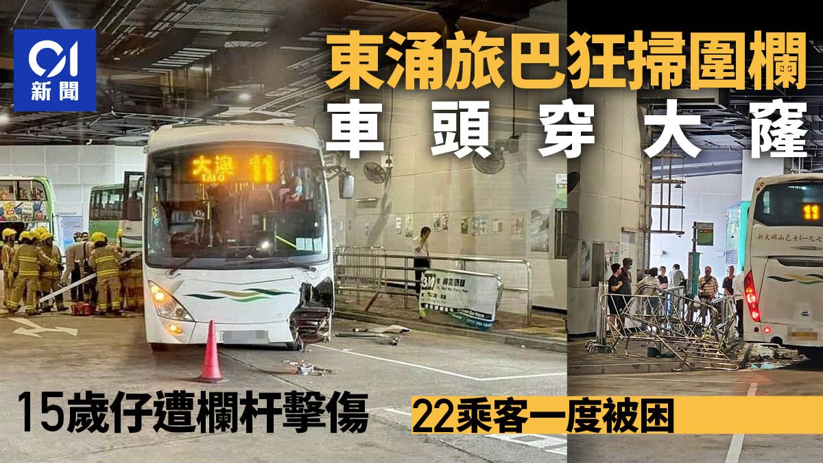 東涌發生驚險車禍。今早(13日)約11時50分,一輛新大嶼山巴士駛離東涌巴士總站期間,失控掃毀行人路多個圍欄。一名15歲少年猝不及防,遭欄杆擊中手、肩,幸仍清醒,事後被送往北大嶼山醫院治理。意外後,旅巴左邊車頭撞穿大洞,零件散落一地;前門疑受損無法開啟,後方緊急逃生門則離地約2米高,22名乘客及司機一度被困車內,消防員趕抵用梯協助車上人等離開車廂。警方經調查後,發現約12米長欄杆及5個約1.2米長的巴士圍欄損毀,43歲姓周巴士車長在場助查。